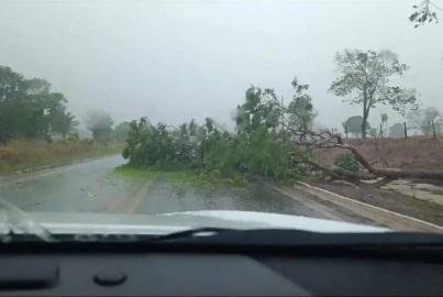 Na rodovia MT-175, que liga São José dos Quatro Marcos a Mirassol D’Oeste, uma árvore caiu sobre a pista durante o temporal. Felizmente, o obstáculo foi removido a tempo por motoristas e moradores que passavam pelo local, evitando acidentes e congestionamentos.